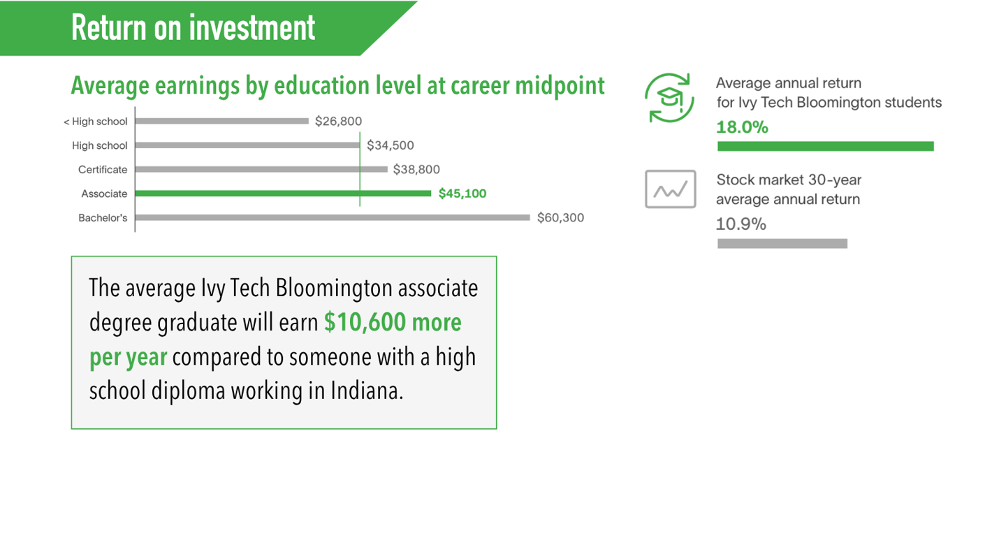 Ivy Tech Bloomington graduates receive a valuable rate of return on their investment and will realize higher future earnings. According to the report, associate degree graduates will earn $10,600 more per year compared to someone with a high school diploma working in Indiana. Over a working lifetime, each graduate will see $434,600 in higher earnings.