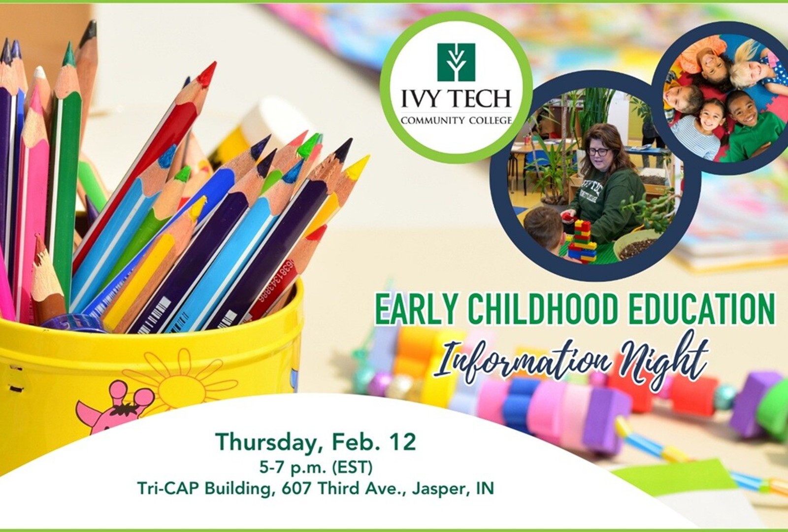 Ivy Tech Community College Evansville, will host an information session for high school students and their parents, and anyone interested in learning more about opportunities in Early Childhood Education on Thursday, Feb. 12. The event will be from 5-7 p.m. (EST) at the TRI-CAP Building, 607 Third Avenue, in Jasper.