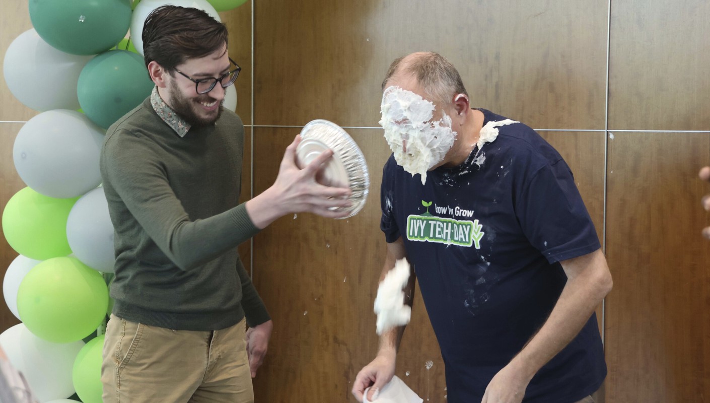 On the Indianapolis campus and at its sites across the service area, the Ivy Tech Day spirit continued the celebration with breakfast at all Indy sites courtesy of Centier Bank. Lunch was catered by Jacquie’s Gourmet Catering at the downtown campus, Ivy Tech alumnus Brady Foster of Foster’s Cafe and Catering at the Lawrence site, and pizza was provided at the Public Safety building and Automotive Technology Center. Throughout the day, students, alumni, faculty, and staff engaged in activities including a student panel, free headshots, arts and crafts, life-size games, popcorn, plant pot painting, and ended with the very popular Pie-A-Faculty event.