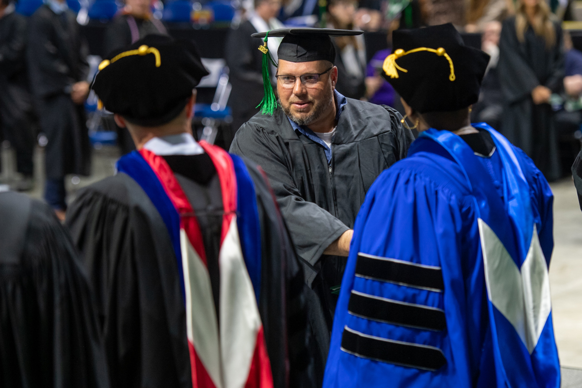 There isn't one. Graduates will line up by school/program. You will be directed by Ivy Tech staff on how to line up, enter the arena, receive your diploma, return to your seat, and exit the arena. Don't worry, we'll guide you each step of the way!