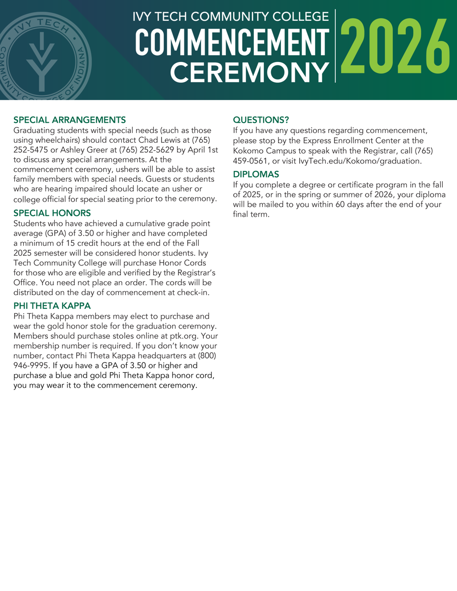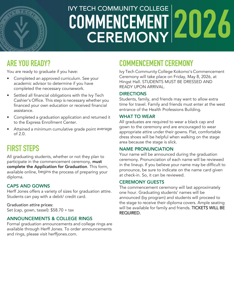 The ceremony will last approximately 60 minutes and include conferral of degrees and induction into the Ivy Tech Community College Alumni Association.